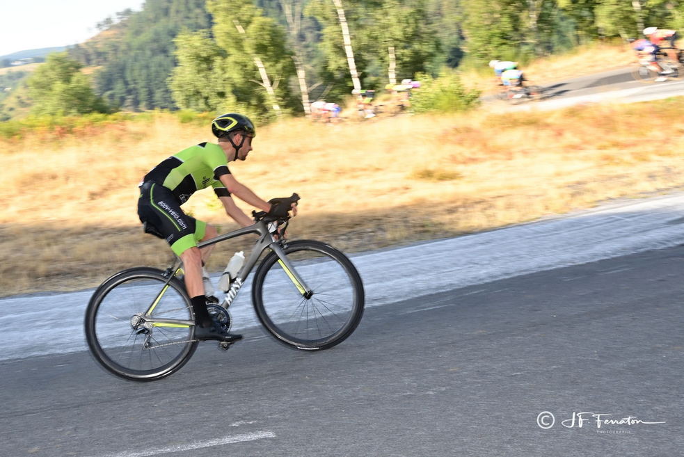 Extraits : « Les gaziers écrèment doucement le peloton dans les bosses. Et ça visse dans les descentes techniques au point qu’on doit régulièrement faire l’effort pour rentrer au pied. Je me fais la peau dans la côte de Fridefont pour accrocher le premier wagon. Comme prévu ça craque de partout dans la côte de Chaudes-Aigues au 40ème km. Je vois avec bonheur la famille Bartlet m’encourager. Je ne cherche pas à suivre le rythme des premiers et on se retrouve à quelques-uns. Je devrais laisser filer ce groupe plus loin malheureusement. Pour moi c’est le début de la fin. J’entends un gars dire que si tu retrouves seul maintenant tu vas trouver le temps long dans les 30kms de plateau qui suivent… J’ai beau le savoir, la fracture du mental est rédhibitoire : je ne bascule pas et me retrouve solo avec un bon petit vent dans le pif. Je finirai par rejoindre un gars en perdition qui a coupé depuis le grand parcours. Il s’avère être un sacré partenaire, on se relaie bien et il me fait mal… Arrêt au stand pour refaire le plein, non sans avoir déraillé et choppé une crampe juste avant. Désormais , le seul objectif est de rallier l’arrivée. Doublé par pas mal de monde dont Monsieur Laurent Brochard dit La Broche, plus aussi fringuant qu’à sa grande époque mais quand même. On se console avec une toute petite victoire au sprint pour la 40ème rugissante. On lâche rien. »